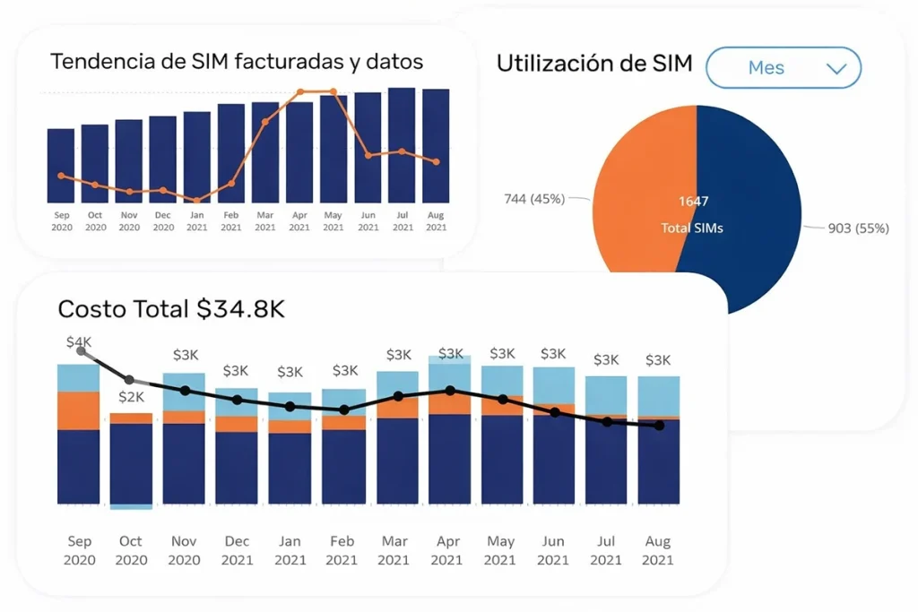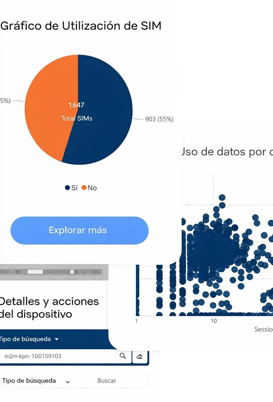 La plataforma simplifica todo el ciclo de vida de la SIM, desde la activación y suspensión hasta los diagnósticos y la optimización. Las herramientas avanzadas de análisis e informes te permiten identificar tendencias, controlar costes y tomar decisiones fundamentadas a medida que tu despliegue crece. Con compatibilidad multinetwork y flexibilidad entre operadores, la plataforma se adapta a tus necesidades en lugar de limitarte con estructuras rígidas.